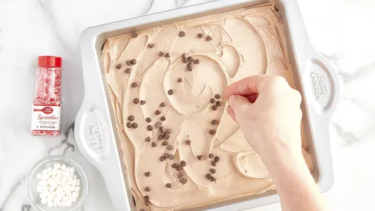 It’s our supreme fudge brownie mix prepared as directed on the box. Our rich and creamy vanilla frosting is cleverly mixed with hot cocoa mix, to make hot cocoa frosting. The brownies are then topped with marshmallow bits and mini chocolate chips, for a decadent treat that’s easy enough to whip up anytime.