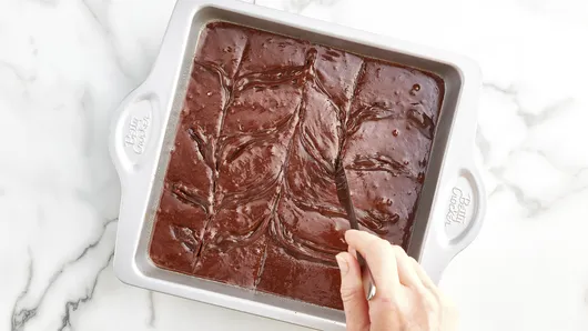 Top with fudge pouch as directed on box. Bake 28 to 33 minutes or until toothpick inserted 2 inches from side of pan comes out almost clean. Cool completely, about 1 hour 30 minutes.