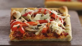 What a deal! Pizzeria-style pizza made super easy at home! Using string cheese makes stuffing the edge of the crust very simple.