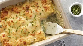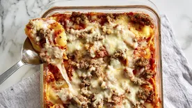Looking for cheesy dinner? Then check out this beef and sausage filled ravioli lasagna that’s garnished with basil leaves.