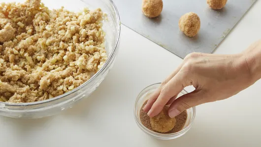 In large bowl, stir cookie mix, softened butter, egg, remaining apple cider drink mix and cinnamon with spoon until soft dough forms. Stir in apple pieces until combined. Shape dough into 40 (1 1/4-inch) balls. Roll balls in sugar-spice mixture. Place 2 inches apart on ungreased cookie sheets. Discard sugar-spice mixture after rolling balls.