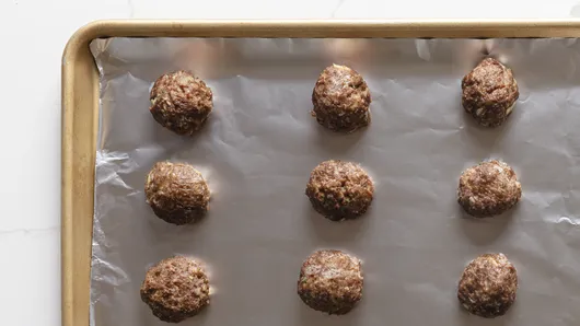 This is the fun part! Shape your mixture into 24 meatballs and place them 1 inch apart on a foil-lined pan. Spray the pan with cooking spray beforehand to prevent sticking.