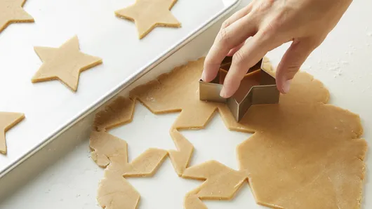 Dip cookie cutters in flour before cutting. This will make it easier to cut out shapes. To make your work easier, cut shapes as close together as possible. This also helps ensure your cookies are as tender as possible, since every time you reroll your dough scraps, the dough gets a little tougher.
