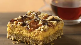 With a tender pumpkin spiced cookie base, sweetened cream cheese filling and a topping inspired by pecan pie, these pumpkin cheesecake bars are strong contenders for the ultimate fall dessert! (And we haven’t even gotten to the whipped cream, caramel and pecan garnish!) For all that dessert, you might be thinking this recipe is bound to be complicated, but we’d like to relieve you of that worry right now. This treat employs several clever shortcuts, which keep the prep time down under a half hour. So next time you can’t decide between pumpkin bars, cheesecake or pecan pie, make this powerhouse recipe!