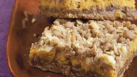 In large bowl, mix cookie mix and pumpkin pie spice. Add 1/2 cup cold butter and the pumpkin; mix with pastry blender or fork until crumbly. Press in bottom of pan. Bake 10 minutes.