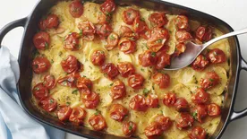 Veggies: Take the look and taste up a notch by substituting some thinly sliced green onions or leeks for the regular onions. If you’d like something even more veggie-forward, opt for a scalloped potatoes recipe that uses vegetables like spinach, broccoli, or mushrooms between the potato layers. We’re also big fans of making Scalloped Potatoes with Roasted Tomatoes—roasting cherry tomatoes makes them extra juicy and intensifies the sweetness. Yum!