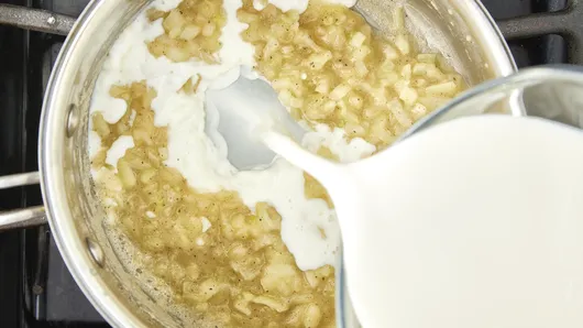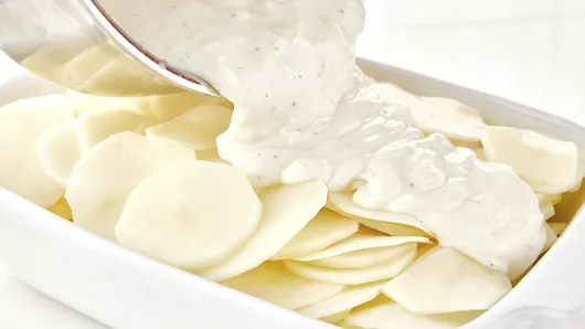 While your oven heats, prep the ingredients you’ll need. We’d recommend slicing up either russet or Idaho potatoes—the dry, light, and fluffy interiors of these potatoes hold their shape well when cooked into scalloped potato dishes. Want to leave the skins on your spuds to make prep even quicker? No problem! Peeling them might look a little neater, but this easy scalloped potatoes recipe leaves the decision up to you. To create uniform slices of potato (about ¼ inch) quickly and easily, try using a mandoline or a food processor fitted with a blade for thin slices. Don't forget to prep your pan with grease, shortening, or your preferred cooking spray—this will prevent the sauce from browning and sticking to the pan.
