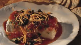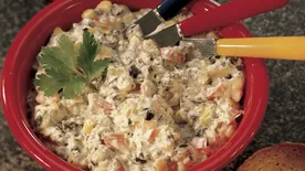 To serve, cut flag shape from carrot curl and secure on toothpick; insert into top of igloo. Garnish igloo with rosemary, bell pepper and cream cheese penguins. Serve with crackers.