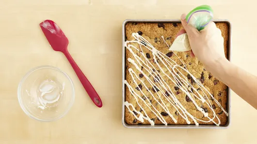 We tested this easy cookie bar baked in a 9-inch pan with a chopped white chocolate bar. Substitute same measurement amount of white vanilla baking chips for chopped white chocolate, if desired.