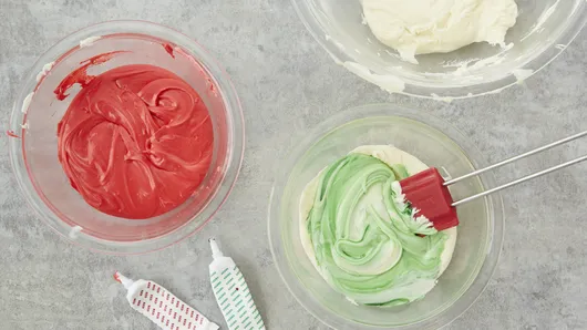 Place 3/4 cup fudge mixture into each of 2 small bowls, leaving remaining untinted fudge mixture in bowl. Tint 1 bowl green and 1 bowl red by stirring in each food color to desired color.