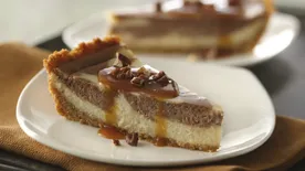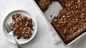 When ready to serve, pour 1/4 cup caramel topping over chocolate frosting; sprinkle with 1/4 cup pecans. Store loosely covered at room temperature.