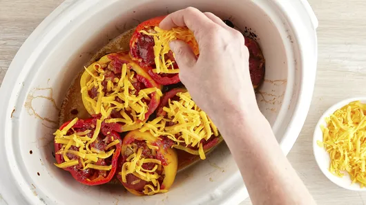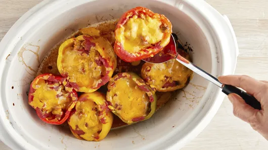 • Cooking up comfort food in the slow cooker is one of the best ways we know to make dinner, and this recipe really delivers. All the cheesy, beefy flavor you love comes through in this hands-off recipe. You can skip the step of boiling peppers, and these will still come out meltingly tender — thanks to the steamy heat of your slow cooker.