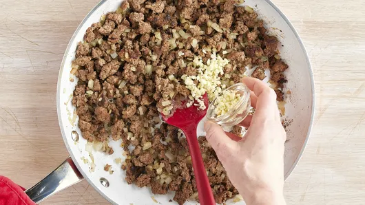 In 12-inch nonstick skillet over medium-high heat, cook beef, onions, salt and pepper 8 to 10 minutes, stirring frequently, until beef is cooked through and onion softens. Add garlic; cook 15 seconds. Drain.
