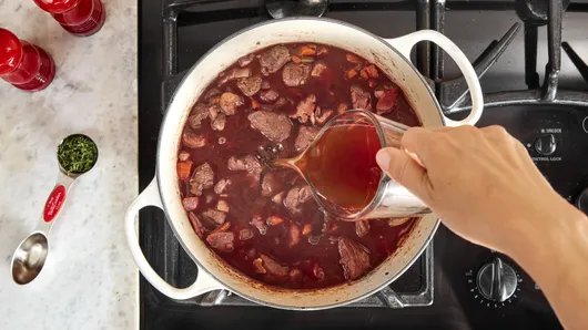 Strain: Place a fine mesh strainer over a large bowl and strain the braising liquid into the bowl. Return the braising liquid to the pan, then transfer the beef mixture to the bowl; cover and keep warm. Bring the braising liquid to a boil over high heat; continue to boil until reduced to desired thickness. Return beef mixture to braising liquid in pan, reduce heat to medium and continue to cook until beef mixture is heated through.