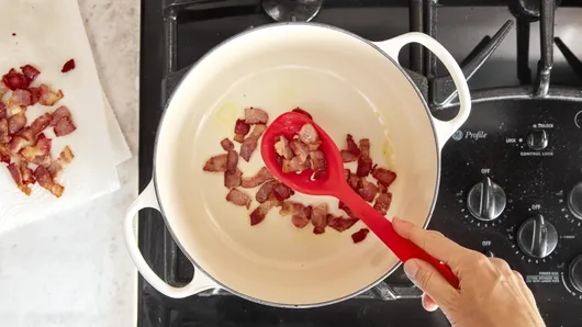 Spraying your Dutch oven or stockpot instead of using oil to cook the bacon lets you use the bacon fat for searing the beef.