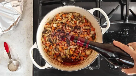 Briefly cook the flour, garlic, and tomato paste. Cooking all at once skips a couple of steps seen in more traditional beef burgundy recipes. Then add the wine. Adding the wine by itself, instead of with the broth, provides all the flavor of the wine without cooking for hours to reduce the liquid.