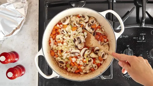 After removing the beef with a slotted spoon, add your onion, carrots, and mushrooms to cook in the bacon and beef pan drippings until the mushrooms are browned. Cooking all vegetables together reduces stirring time.