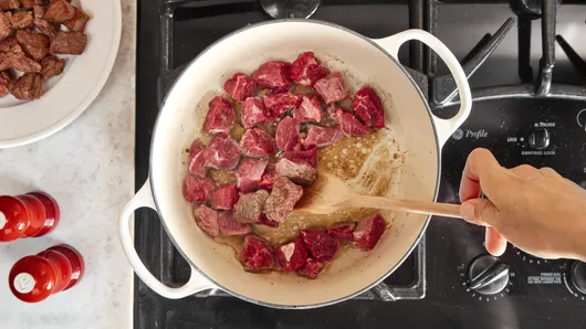 First, you'll be cutting the beef into smaller portions, this allows the stew to cook faster. Plus, searing the seasoned beef in batches creates a flavorful browned crust on each piece.