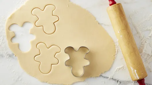 Take out one half of dough from refrigerator, and unwrap. On work surface sprinkled generously with flour, roll dough to 1/4-inch thickness. Cut with floured 4-inch gingerbread boy cookie cutter. On ungreased cookie sheet, place cutouts 2 inches apart. Bake 6 to 8 minutes or until edges are lightly golden brown. Cool 2 minutes; remove from cookie sheet to cooling rack. Cool completely, about 30 minutes. Repeat steps with second half of dough, adding leftover pieces into the mix to reroll.