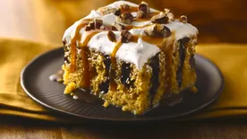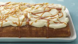 Meanwhile, in small bowl, mix 1/4 cup of the caramel sauce and the sea salt. Poke warm cake every inch with a straw or handle of wooden spoon, halfway into cake. Pour caramel-salt mixture over cake, allowing it to fill in holes.