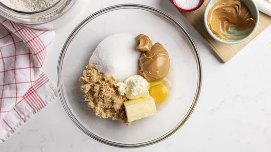 In a large bowl, mix together granulated sugar, brown sugar, peanut butter, shortening, butter, and 1 egg until well combined. Stir in all-purpose flour, baking soda, baking powder, and salt until just combined. Be careful not to overmix—we want our peanut butter cookies to come out super tender, not tough!