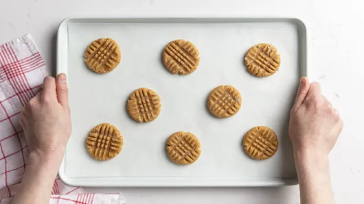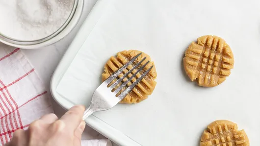 • The fork-tined hash mark gives homemade peanut butter cookies their distinctive look. How did this baking tradition come to be? The first instructions for making the mark on the top of peanut butter cookies was in a recipe from a 1936 Pillsbury cookbook. There was no reason given for the marking, but some bakers and food experts suggest that it serves a very practical purpose by helping the cookies bake more evenly. That’s important because the addition of peanut butter makes the dough denser and more difficult to bake thoroughly. By putting the fork-tine marks in cookie dough balls, they’re being flattened for more even baking. The result is a cookie that’s soft and chewy, with contrasting crispy edges where the marks have been formed. Get more handy tips for peanut butter cookie recipes in the How to Make Peanut Butter Cookies guide and find creative variations on the basic in Betty's best peanut butter cookies collection.
