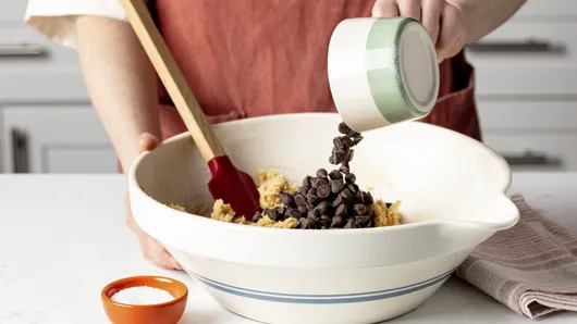 First, you’ll combine a few dry ingredients—flour, baking soda and salt—in one bowl. In another bowl, cream the granulated and brown sugars into softened butter for a fluffy mixture. Beat in an egg and vanilla, then stir in your flour mixture until just blended to form a stiff dough. In baking, you’ll typically always mix dry ingredients into wet ones for even distribution and mixing. Stir in the chocolate chips (an absolute necessity) and nuts (optional), and you’re almost ready to bake some delicious homemade chocolate chip cookies.