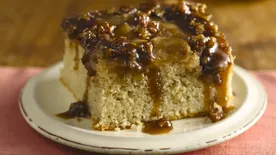 Bake 41 to 47 minutes or until toothpick inserted near center comes out clean. Cool in pan 10 minutes. Loosen sides of cake from pan. Place heatproof serving platter upside down on pan; carefully turn platter and pan over. Let pan remain over cake about 1 minute so caramel can drizzle over cake. Remove pan.