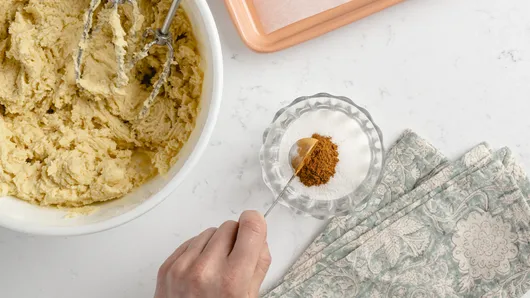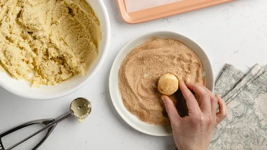 You want your cookie dough balls well coated in the cinnamon-sugar mixture, since that’s the best part! The best way to do it? Pour the mixture onto a large plate, so there’s plenty of room for rolling.