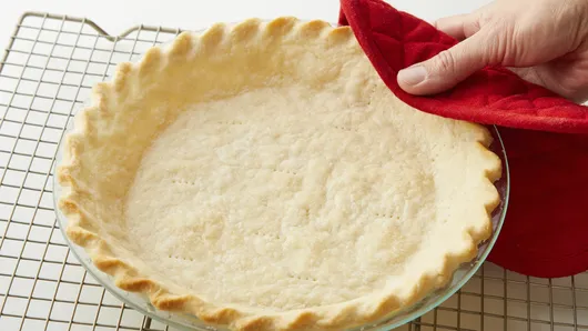 Heat oven to 450°F. With floured rolling pin, roll pastry on lightly floured surface into round 2 inches larger than upside-down 9-inch glass pie plate. Fold pastry into fourths; place in pie plate, or roll pastry loosely around rolling pin and transfer to pie plate. Unfold or unroll pastry and ease into plate, pressing firmly against bottom and side. Trim overhanging edge of pastry 1 inch from rim of pie plate. Fold and roll pastry under, even with plate; flute as desired. Prick bottom and side of pastry thoroughly with fork to prevent puffing. Bake 13 to 15 minutes or until light brown; cool on cooling rack.