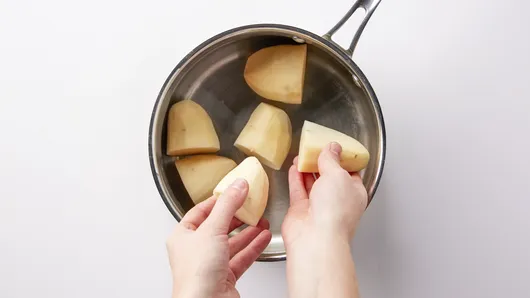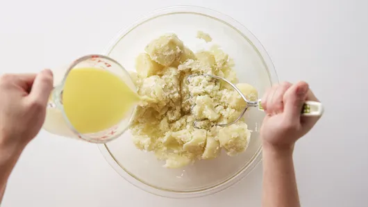 Drying the potatoes for a bit after boiling them ensures the potatoes will be fluffier than if they are waterlogged. Russet or Idaho potatoes are the best variety to use in this recipe. They're easier to peel, light and starchy. Use either an old-fashioned handheld potato masher (the kind with a grid head works particularly well) or an electric hand mixer, just be watchful the potatoes don’t become overworked and gluey.