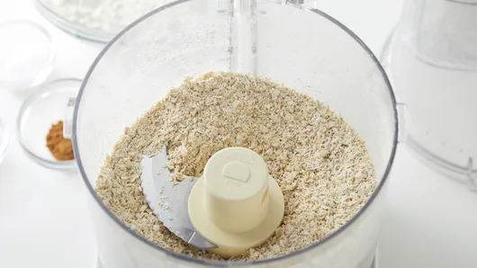 Heat oven to 375°F. In food processor, place 2 cups of the oats; cover and process until coarsely ground (texture will be like coarse ground flour). Pour into medium bowl; stir in remaining 1 cup oats, the flour, cinnamon, baking soda, ginger, baking powder, salt and cloves. Set aside.