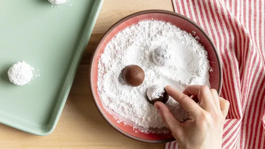 Want to make sure you get that one-of-a-kind crinkle texture? Let the dough chill in the fridge for the full resting time, roll it into evenly-sized balls and generously coat each one in powdered sugar. It’s as simple as that!