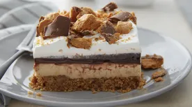 When ready to serve, place 6 reserved cookies into quart-size resealable food-storage plastic bag. Seal bag; coarsely crush cookies with rolling pin. Sprinkle on top. Cut into 6 rows by 4 rows. Cover and refrigerate any remaining pieces.