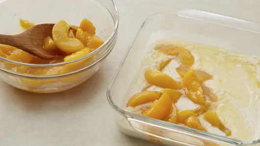 After preheating your oven, this peach cobbler recipe will come together quickly in an 8-inch square glass baking dish. No need to grease your dish beforehand, the moisture from your fruit filling will help keep the cobbler from sticking to the bottom.