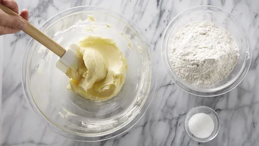 Be sure your butter is room temperature (let it sit on the counter for at least 30 minutes) before making our shortbread cookie recipe. This dough is stiffer than most rolled cookie doughs, so we have you mix the sugar into the butter before adding the flour. Follow our measuring guide to be sure you’re adding the right amount of flour.