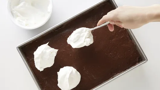 When spreading the layers of filling, its best to drop dollops and then spread over the surface using the back of a spoon or an icing spatula.