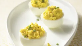 Chipotle Deviled Eggs: Omit the mustard. Stir 1 thinly sliced green onion and 1 1/2 to 2 teaspoons finely chopped, drained chipotle chiles in adobo sauce (from a 7-oz can) into the yolk mixture. Garnish with chopped fresh cilantro leaves and a sprinkle of chili powder.