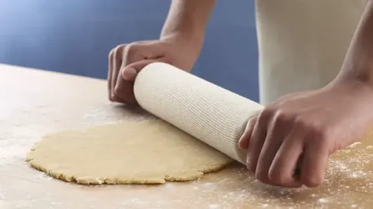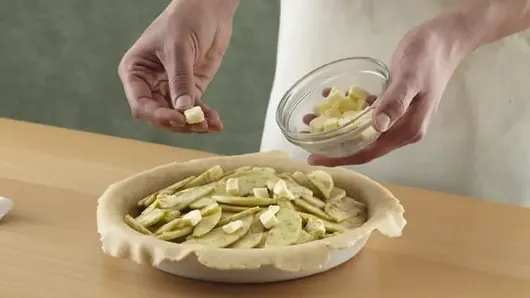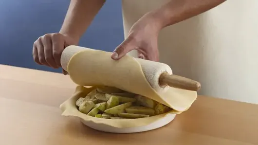 For a nice defined crimped crust, lay the top pastry over the apple filling and press it firmly against the overhang of the bottom crust. Fold the pastry together and over to build up an even ridge of dough. Use the handle of a wooden spoon to mark evenly spaced sections to twist with your fingers into a decorative edge.