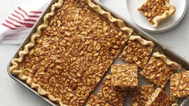 This slab pie is a little slice of heaven for peanut butter-banana fans! Peanut butter cookie crust is topped with sliced bananas, creamy peanut butter filling and whipped topping before getting finishing touches of drizzled peanut butter and extra bananas.