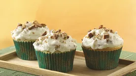 Be sure to glaze the cupcakes while still warm, and adhere the pecan garnish while the glaze is still wet.