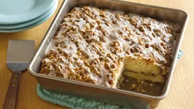 Heat frosting in microwavable bowl 10 to 15 seconds or until easy to drizzle. Drizzle frosting over cake; sprinkle with pecans.