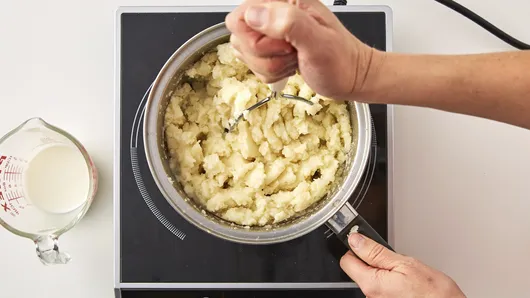 Mash potatoes in pan until no lumps remain. Add milk in small amounts, mashing after each addition (amount of milk needed to make potatoes smooth and fluffy depends on kind of potatoes used).