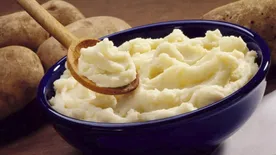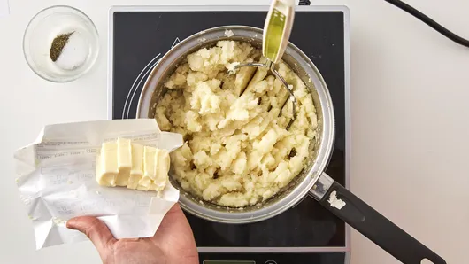 Heat up your milk and soften your butter on either the stove top or in the microwave before adding to the mix. Remember to add the milk slowly until you get the smooth, creamy texture that you want. A standard kitchen rule is that you can always add more, but you can’t take it out. If you add too much milk, you’ll wind up with potato soup—and you probably don't want your mashed potatoes that creamy. Gently mash your potatoes—don’t over whip them as this can also cause the gluten to affect your overall results.