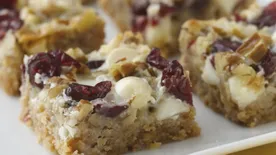Bake 15 minutes. Pour condensed milk evenly over surface. Sprinkle white vanilla baking chips, pecans, cranberries and coconut evenly over top. Bake 18 to 20 minutes or until bubbling along edges and coconut is lightly toasted. Cool completely on cooling rack, about 2 hours. Cut into 8 rows by 4 rows.